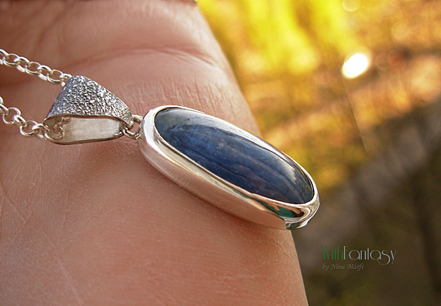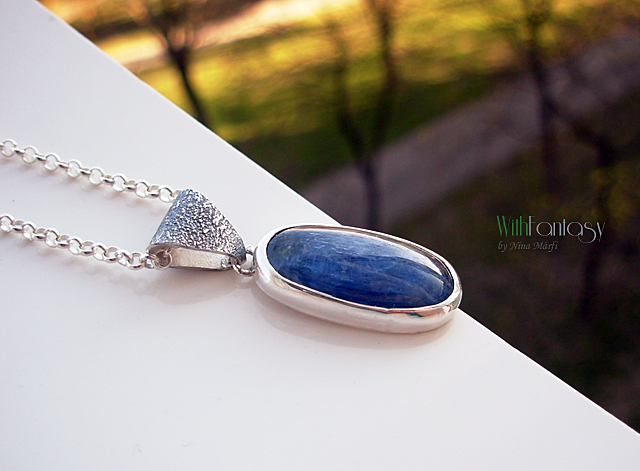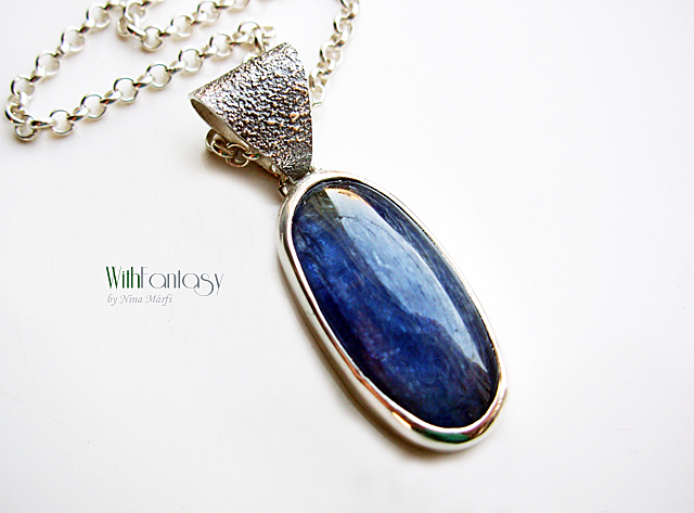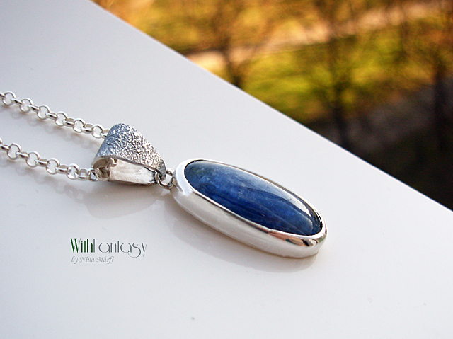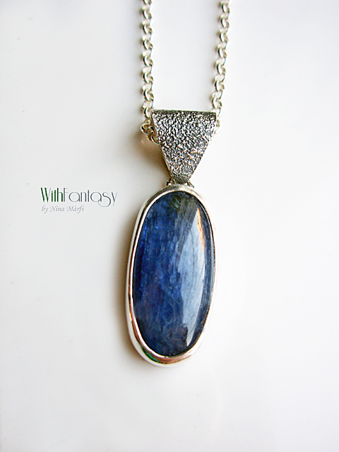 Egyedi, optimista medál, tökéletes tavaszra és nyárra, teljesen kézzel készült ezüstből és gyönyörű kianittal. A medál részben texturált , oxidált és polírozott.