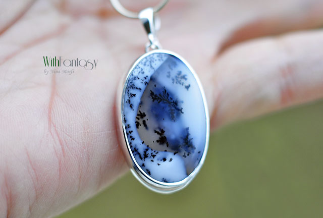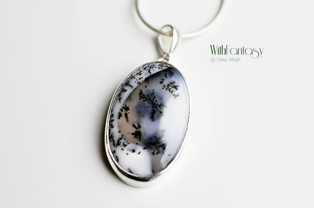 Klasszikus, igazan nőies, ezüst medál különleges dendrites acháttal. A kő nagyon jó minőségű és egyedi. Ez a dendrites achát olyan, mintha a természet festette miniatűr látkép lenne. Tökéletes nyárra és a téli időszakra is. Az ezüst fehér és polírozott.