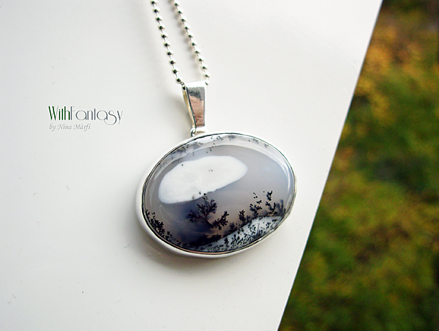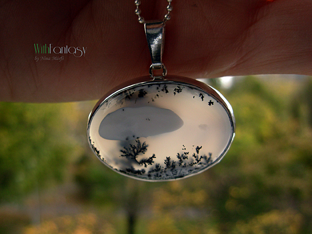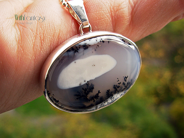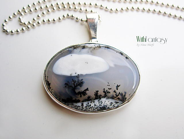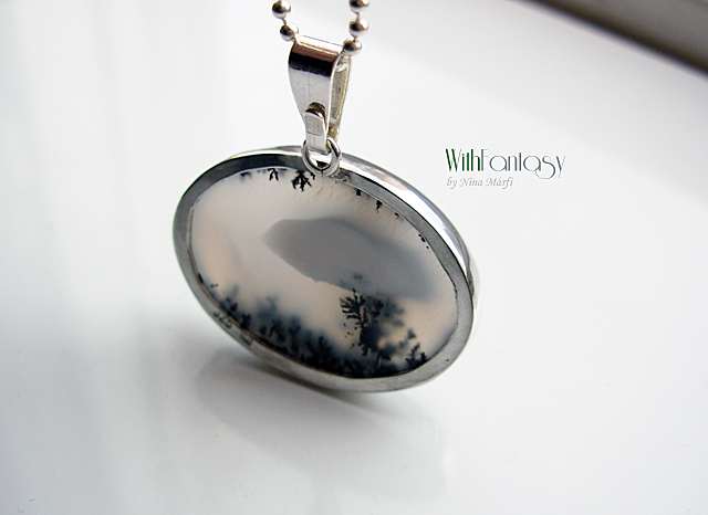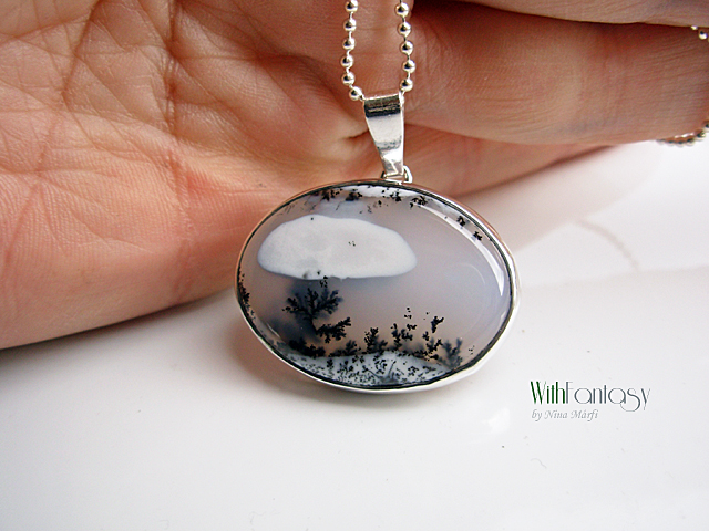 Klasszikus, igazan nőies, ezüst medál különleges dendrites acháttal. A kő nagyon jó minőségű és egyedi. Ez a dendrites achát olyan, mintha a természet festette miniatűr látkép lenne. Tökéletes nyárra és a téli időszakra is. Az ezüst oxidált és polírozott.