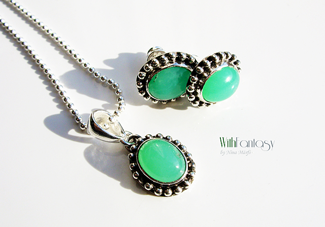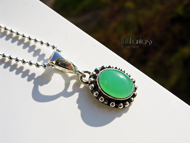 Elegáns, diszkrét,ezüst medál gyönyörű tiszta zöld krizoprázzal. A kő nagyon jó minőségű, Az ezüst oxidált és polírozott.