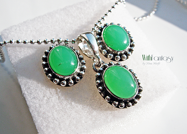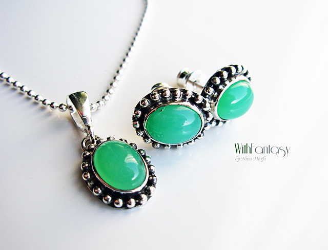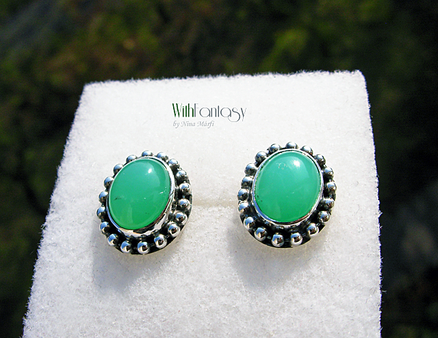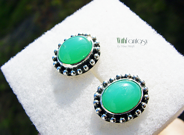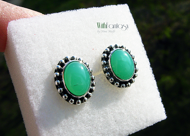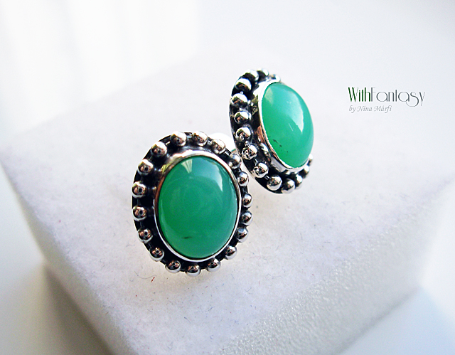 Elegáns, diszkrét, bedugós fülbevaló gyönyörű tiszta zöld krizoprázzal. A kövek nagyon jó minőségűek, Az ezüst oxidált és polírozott.