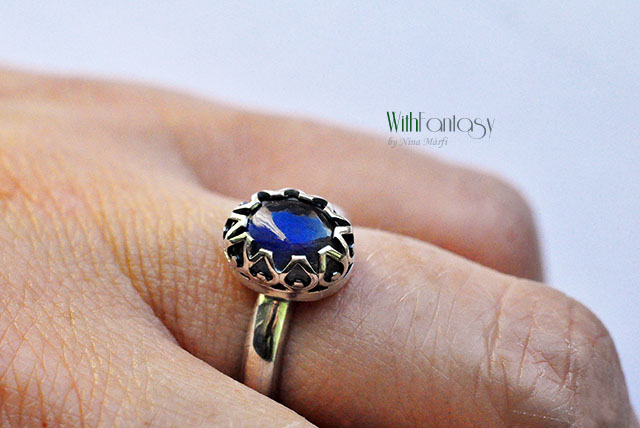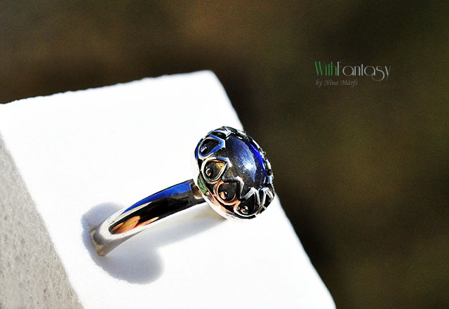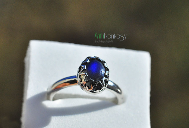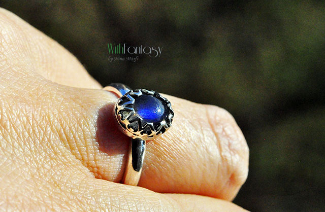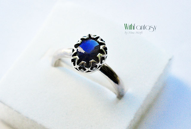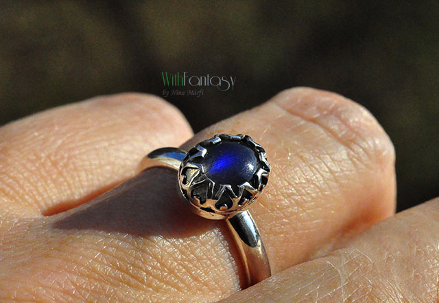 Igazan nőies, fdiszkrét gyűrű gyönyörű, misztikus labradorittal. A kő nagyon szép, tiszta, erős, kék fénnyel ragyog. Az ezüst oxidált és polírozott.