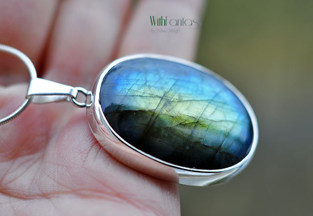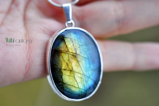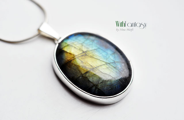Egyedi, érdekes, ezüst medál gyönyörű, ritka, misztikus, tengeri színű (féll kék fél arany) labradorittal. A kő nagyon jó minőségű, tényleg érdekes. Az ezüst fehér és polírozott.