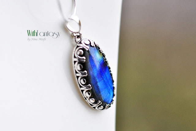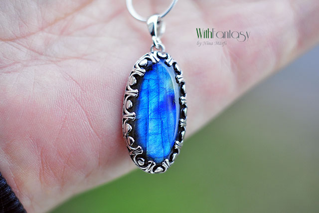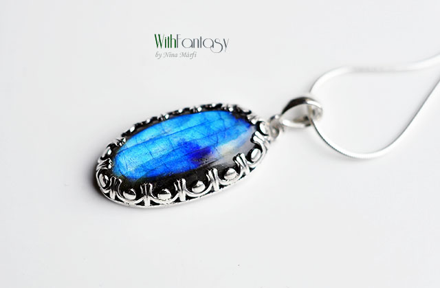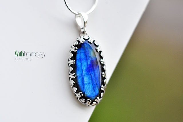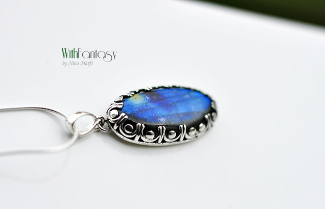 Elegáns, ezüst medál gyönyörű labradorittal. A medál romantikus, retró hatású, kézzel készült, oxidált és polírozott. A kő nagyon szép, nagyon jó minőségű, erős, kék fénnyel ragyog.