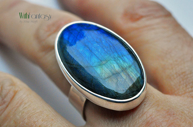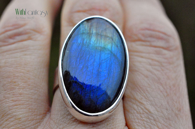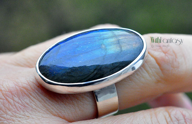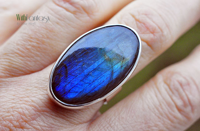gyszerű, ezüst gyűrű gyönyörű labradorit kabosonnal. A kő nagyon szép, kék és arany fénnyel ragyog. Az ezüst fehér. Kérésre oxidálom.