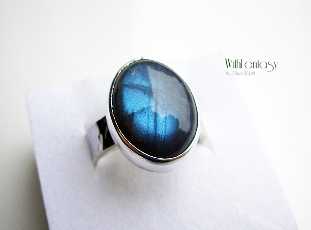 Egyszerű, ezüst gyűrű gyönyörű labradorit kabosonnal. A kő nagyon jó minőségű, erős kék fénnyel ragyog. Az ezüst fehér. Rendélésre készült.