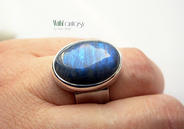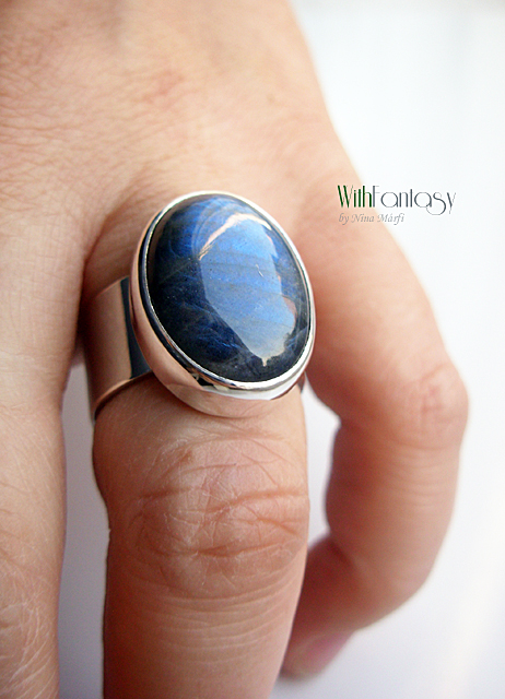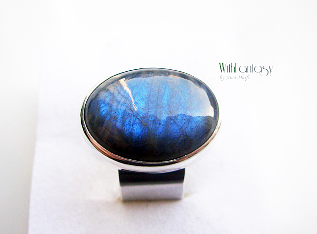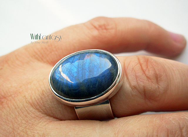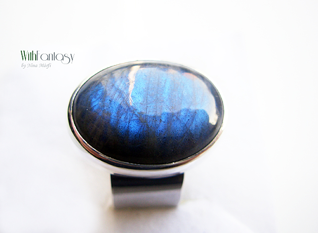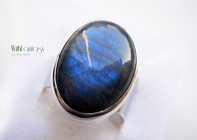Masszív, ezüst gyűrű gyönyörű, nagy labradorittal. A kő erős, kék fénnyel ragyog. Az ezüst fehér, polírozott.