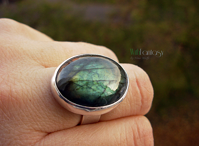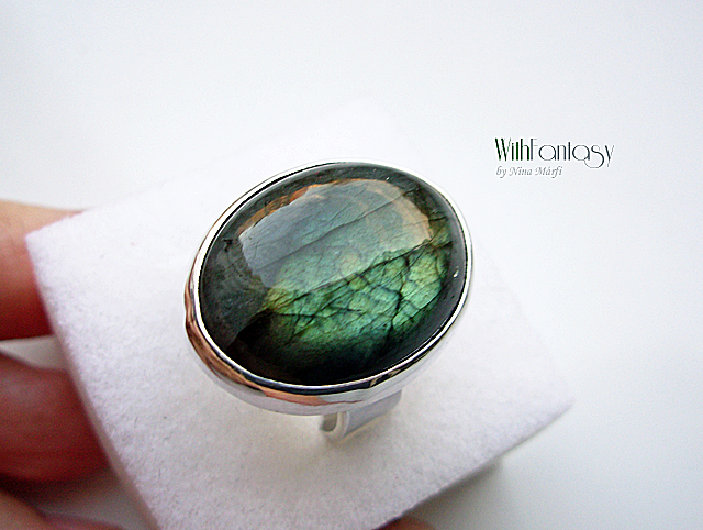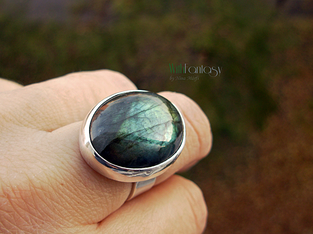 Egyszerű, ezüst gyűrű gyönyörű labradorit kabosonnal. A kő nagyon szép, kék és arany fénnyel ragyog. Az ezüst fehér. Kérésre oxidálom.