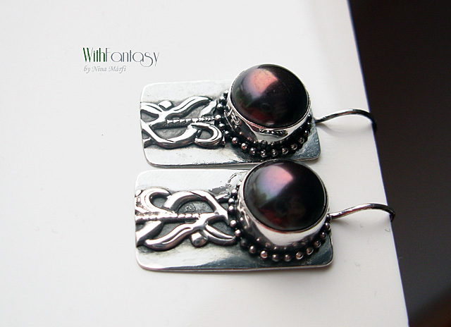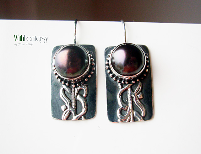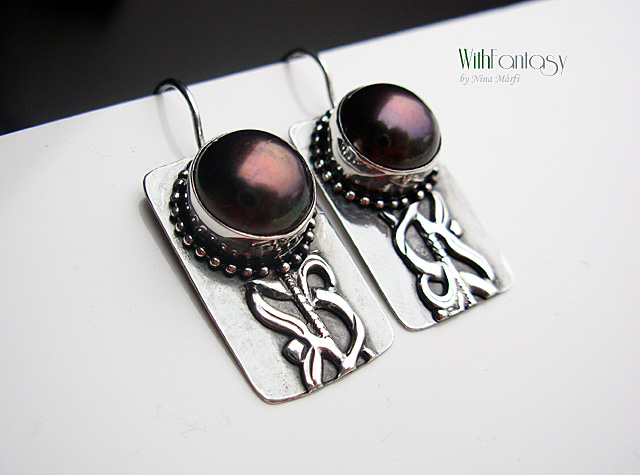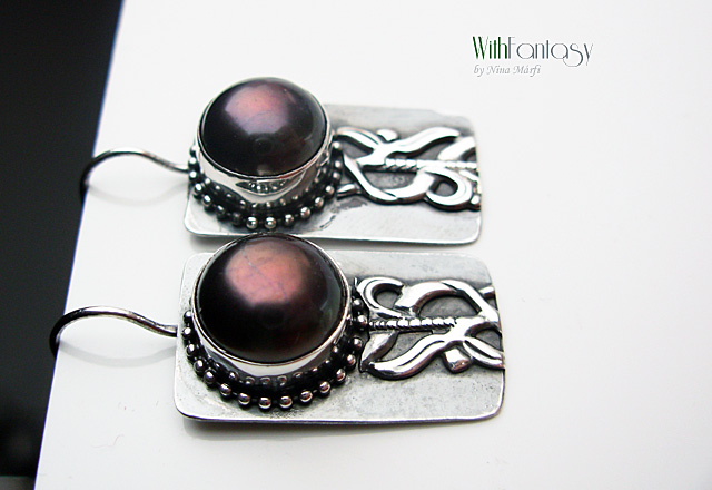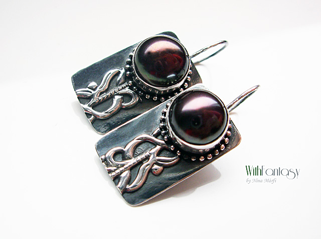Egyedi, ezüst fülbevaló padrizsan színű gyönyökkel. A fülbevaló teljesen kézzel készült. Az ezüst oxidálr és polírozott.