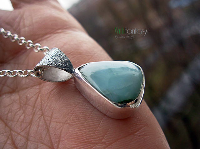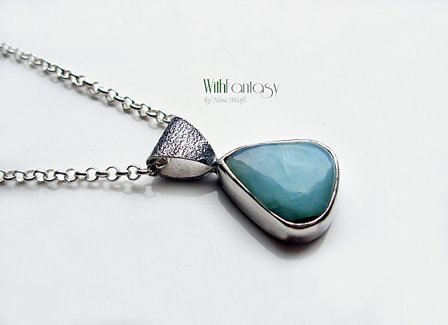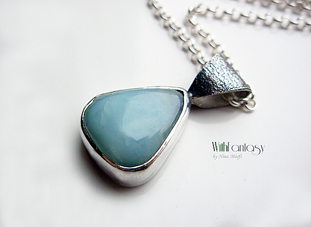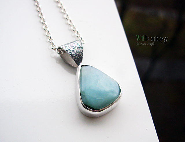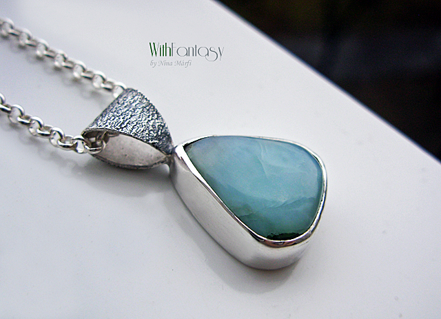 Kis, finom medál, tista, világos kék színű larimarral, tökéletes tavaszra és nyárra, teljesen kézzel készült ezüstből. A medál részben texturált , oxidált és polírozott.