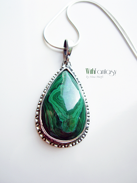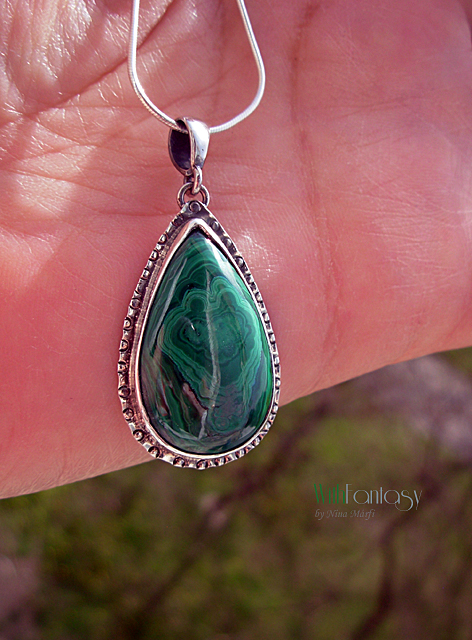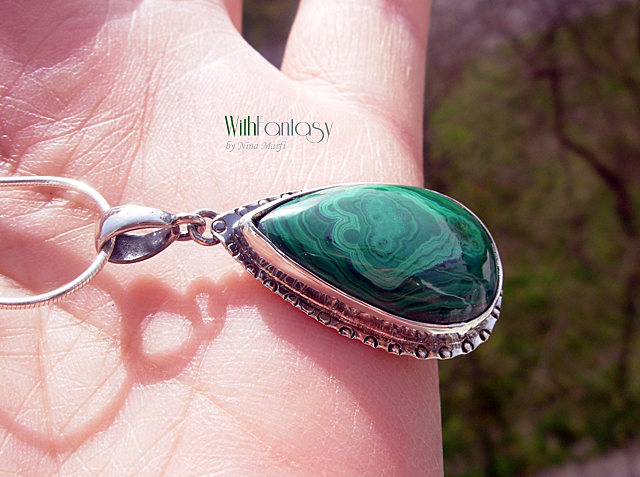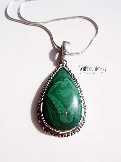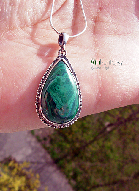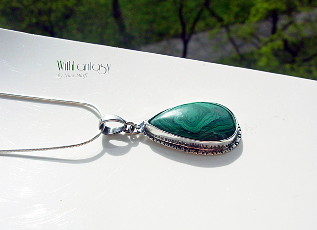 Egyedi, optimista medál, tökéletes tavaszra és nyárra, teljesen kézzel készült ezüstből és érdekes mintájú malachittal. A medál oxidált és polírozott.