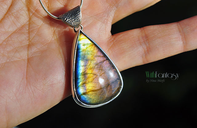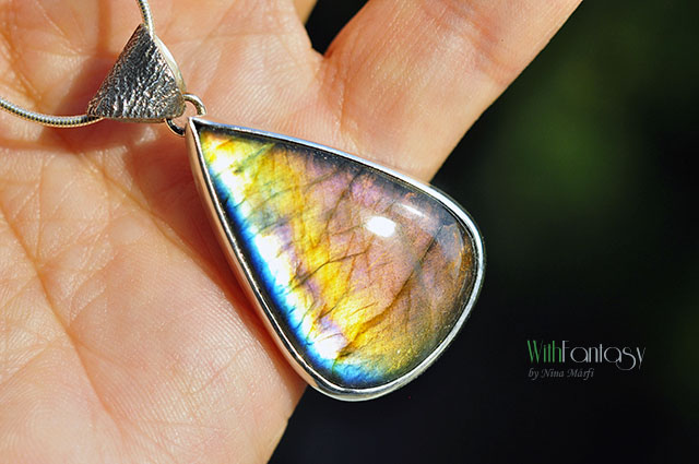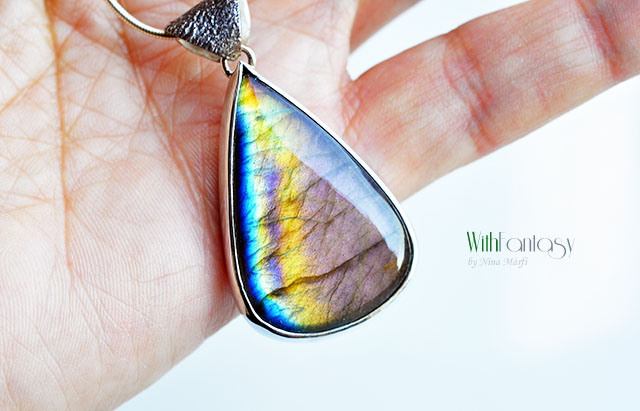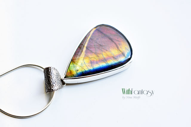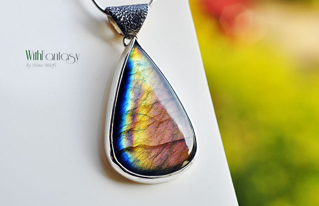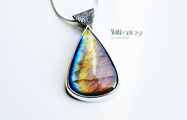 Egyedi, érdekes, ezüst medál gyönyörű, ritka, misztikus lila, rózsaszín és arany labradorittal . A kő nagyon jó minőségű, erős rózsaszín és arany fénnyel ragyog. Az ezüst részben texturált, oxidált és polírozott.