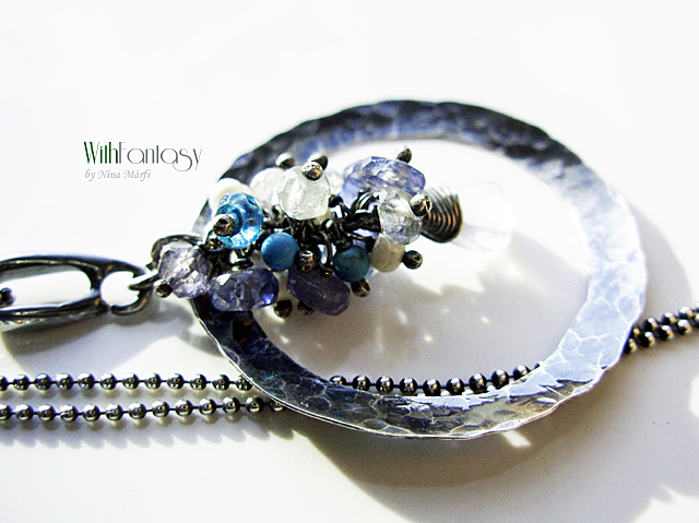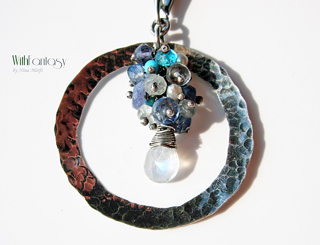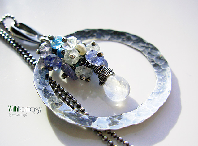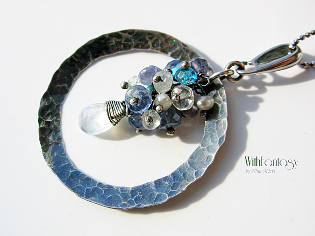 Ezüst medál kis, átlátszó holdkő cseppel, kék és fehér kövekkel ( kianit, tanzanit, akvamarin, kvarc, türkíz, holdkő, gyöngy)A holdkő nagyon szép, világos kék fénnyel ragyog.