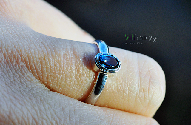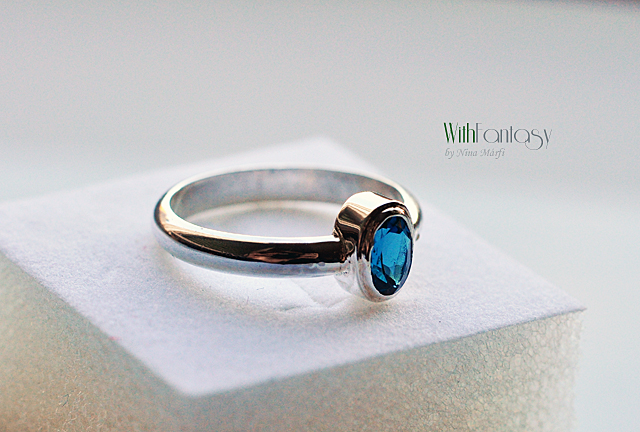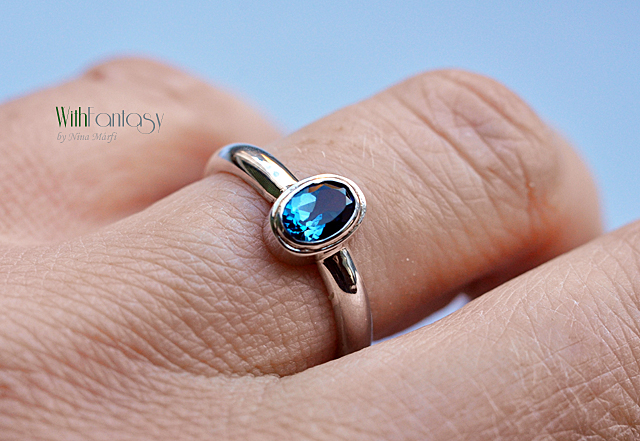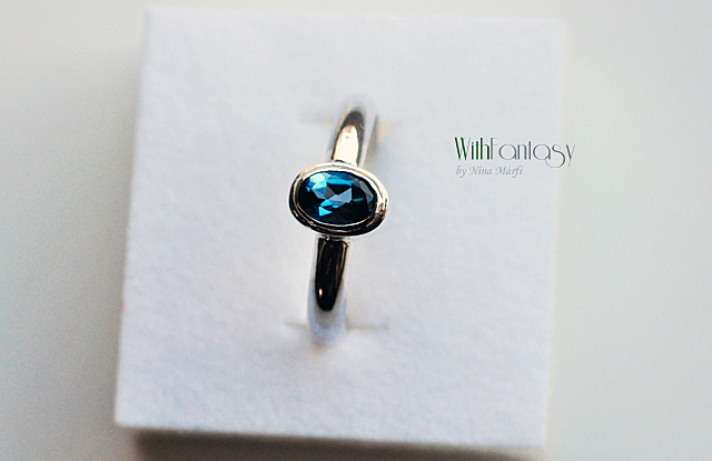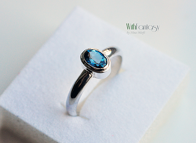 Ellegáns, univerzális gyűrű gyönyörű topázzal ( london blue színben). A kő nagyon jó minőségű, gyönyörű, tiszta, intenzív kék színű. Az ezüst fehér és polírozott.