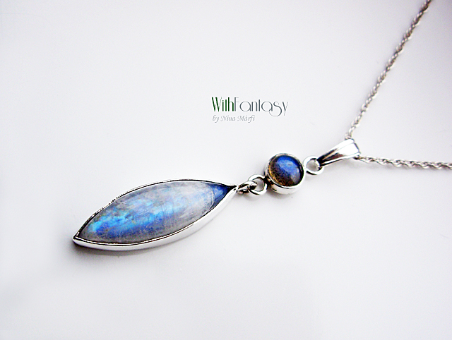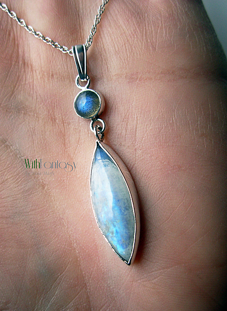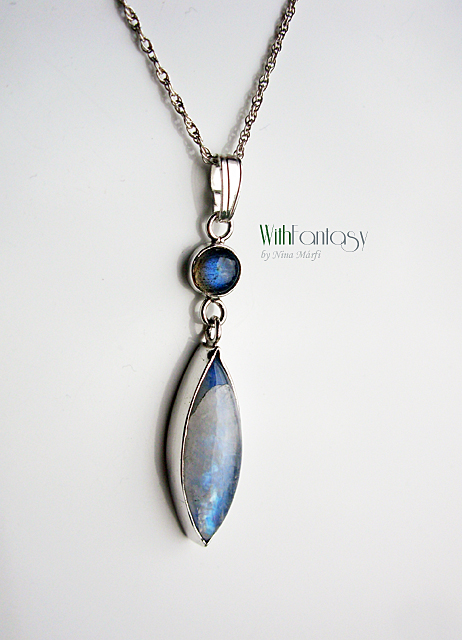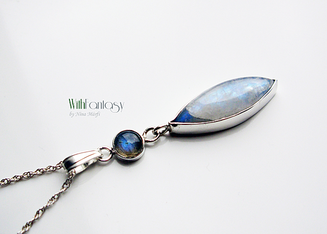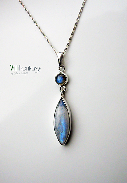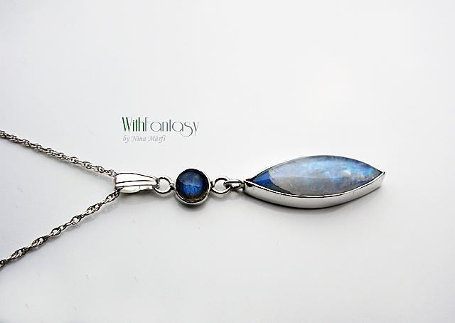 Egyedi, elegáns medál gyönyörű hold kővel és labradorittal. A medál kézzel készült fehér ezüstből. A kövek erős kék és szivárvány színű fénnyel ragyognak.