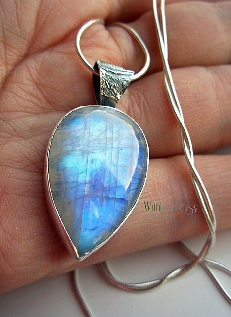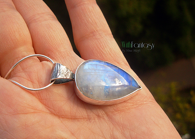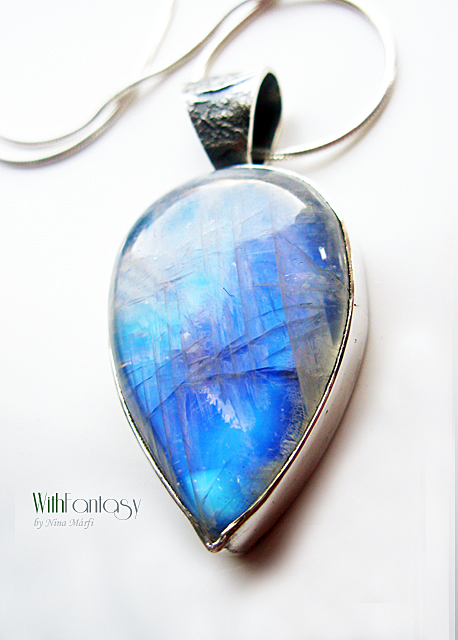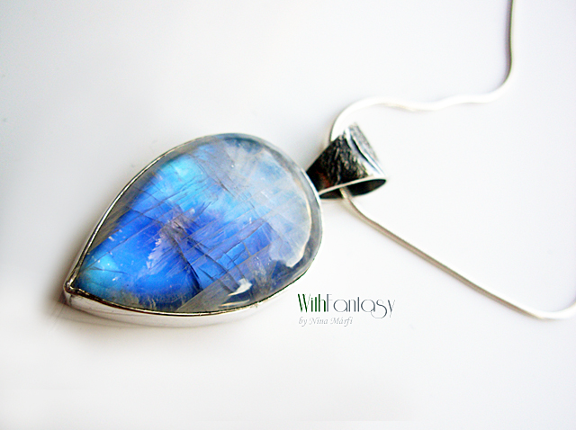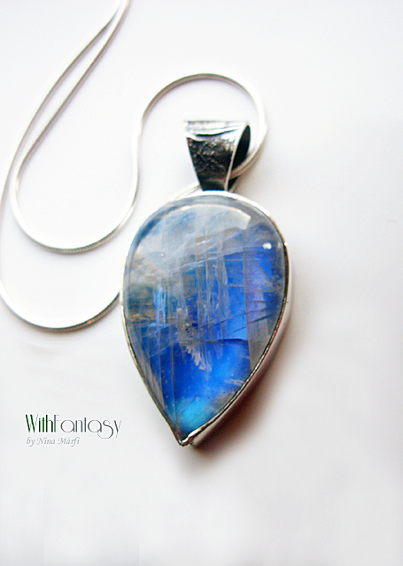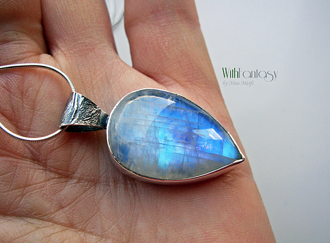 Egyedi, egyszerű, ezüst medál gyönyörű misztikus holdkővel. A medál kézzel készült, részben oxidált és polírozott. A kő nagyon jó minőségű, erős kék fénnyel ragyog.