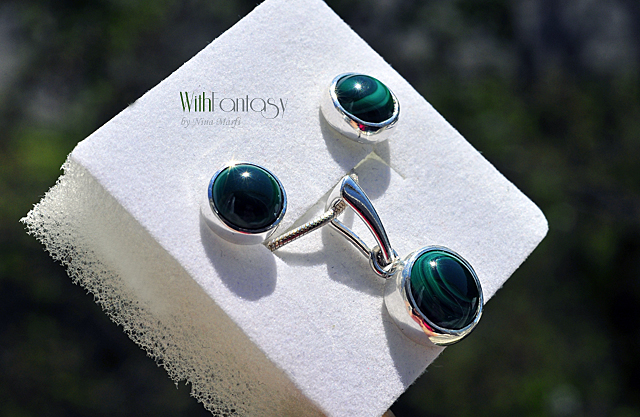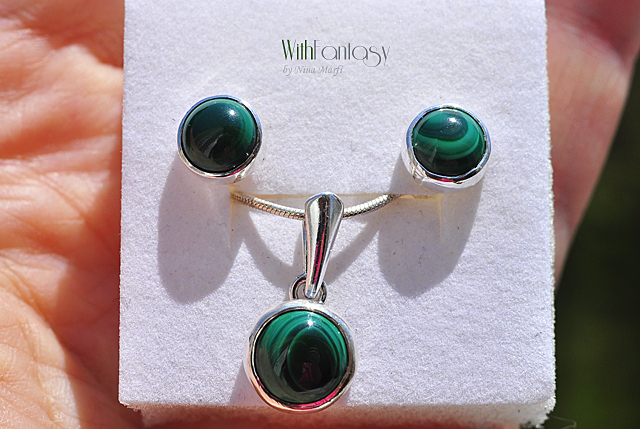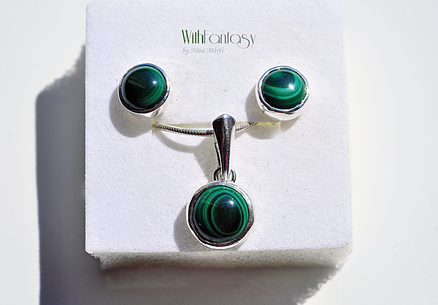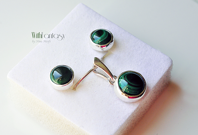 Egysyerű, finom, diszkrét nyári szett (fülbevaló és medál) gyönyörű malachittal. A fülbevaló bedugós, az ezüst fehér, polírozott.