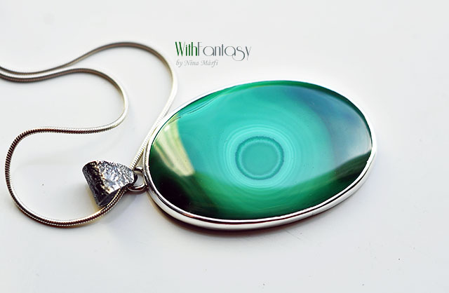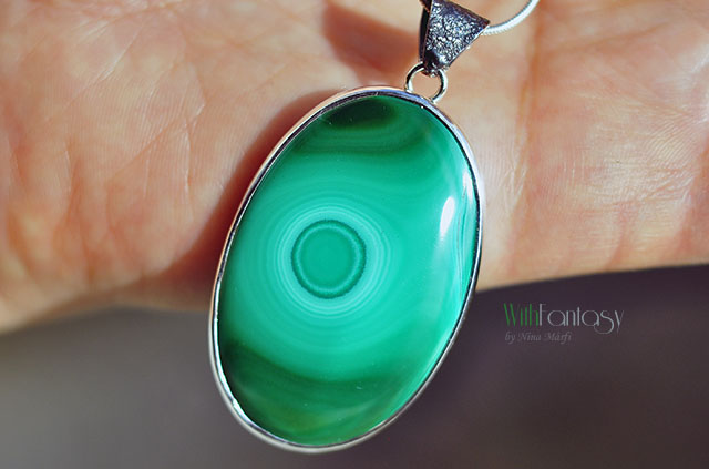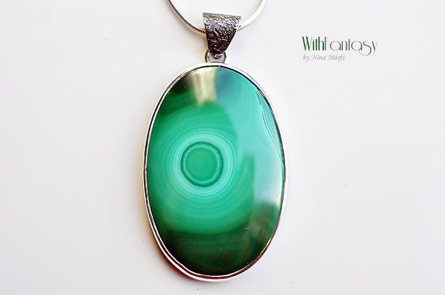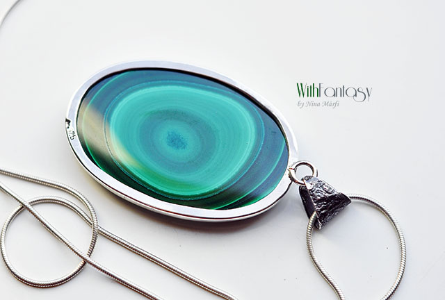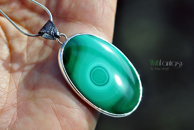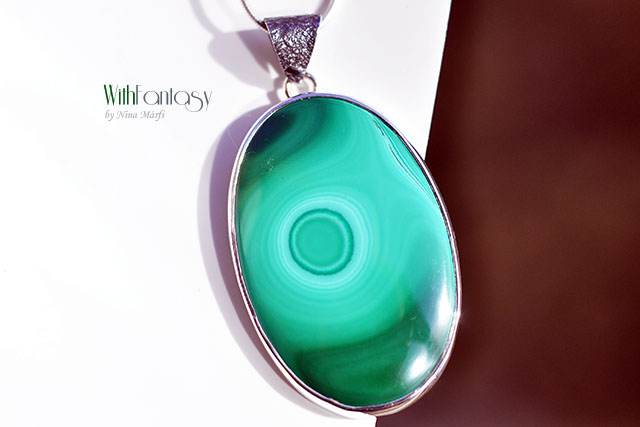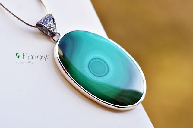 Egyedi, optimista medál, tökéletes tavaszra és nyárra, teljesen kézzel készült ezüstből és érdekes mintájú malachittal. A kő legjobb minőségű, gyönyörű, nagy. A medál részben texturált, oxidált és polírozott.