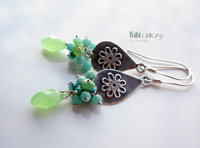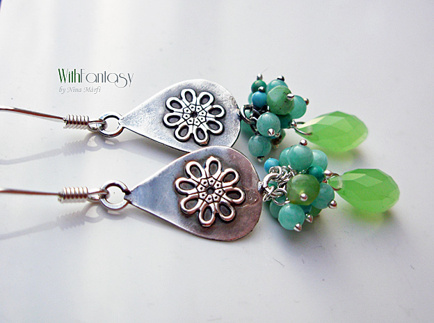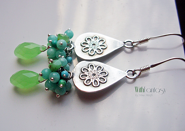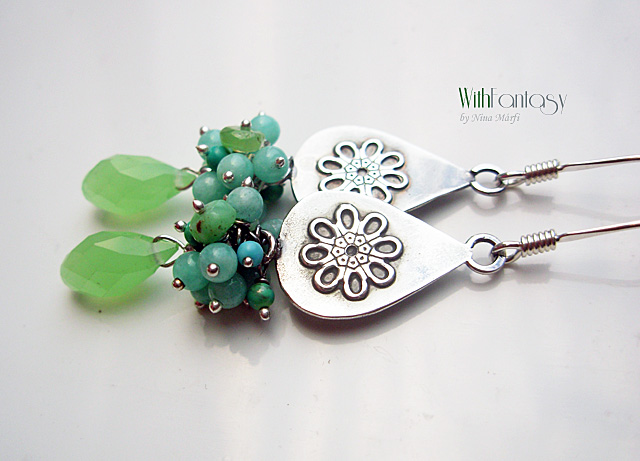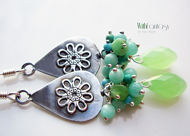 Friss, hosszú, ezüst fülbevaló világos, menta színekben, teljesen kézzel készült, oxidált és polírozott.