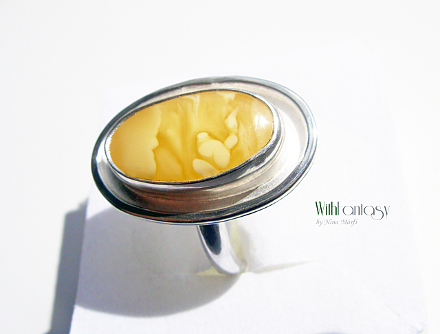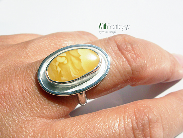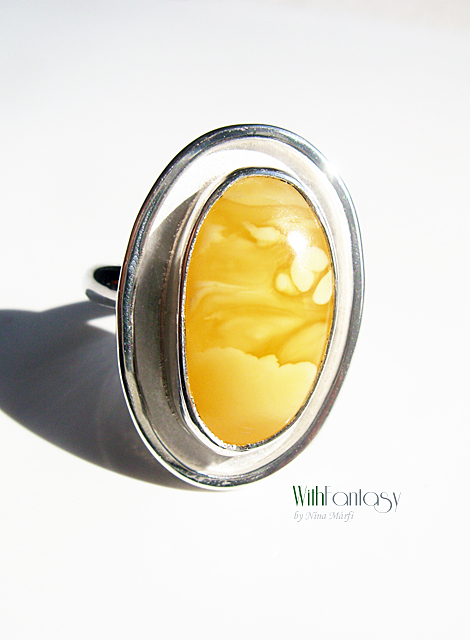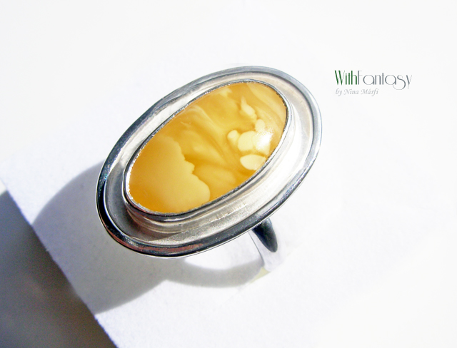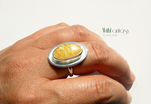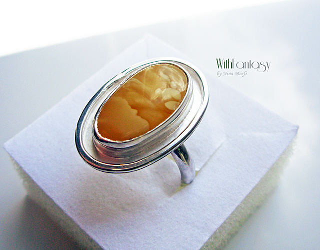 Egyedi, klasszikus, ezüst gyűrű gyönyörű, különleges borostyánnal. Az ezüst fehér, polírozott.