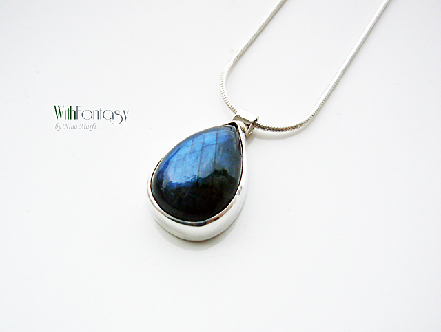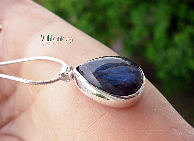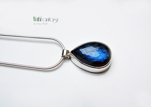 Egyszerű, finom ezüst nyaklánc gyönyörű labradorittal. A kő nagyon szép, erős, sötét kék fénnyel ragyog. Az ezüst fehér és polírozott.
