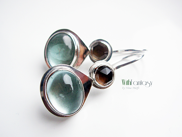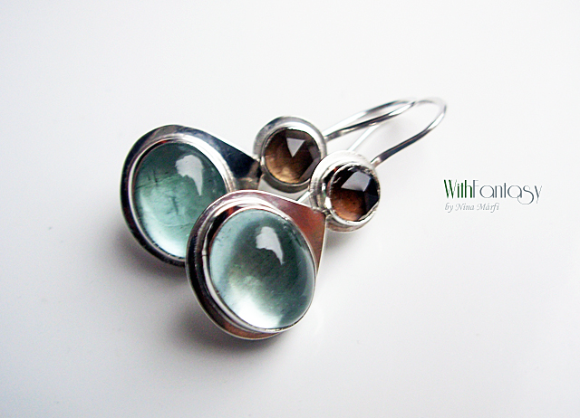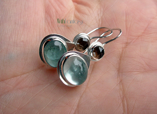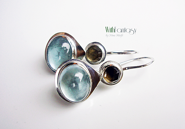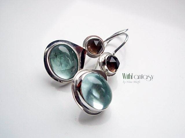 Egyedi, finom, ezüst fülbevaló gyönyörű, tiszta, átlátszó akvamarinnal és füstkvarccal. A kövek nagyon jó minőségűek. A fülbevaló diszkrét, nagyon kényelmes, ajánlott mindennapi viseletre.