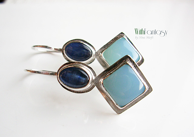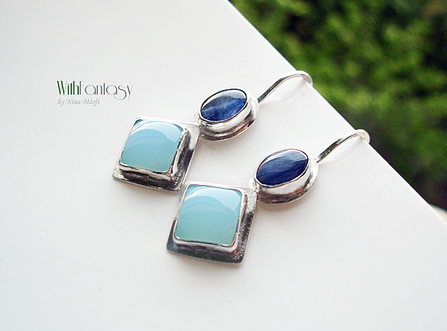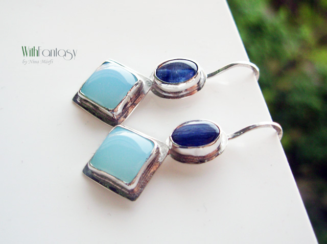 Egyedi, ezüst fülbevaló kék acháttal és kianitta, kézzel készül és polírozott. Az ezüst fehér, kövek pedig friss, tista, intenzív kék színű.