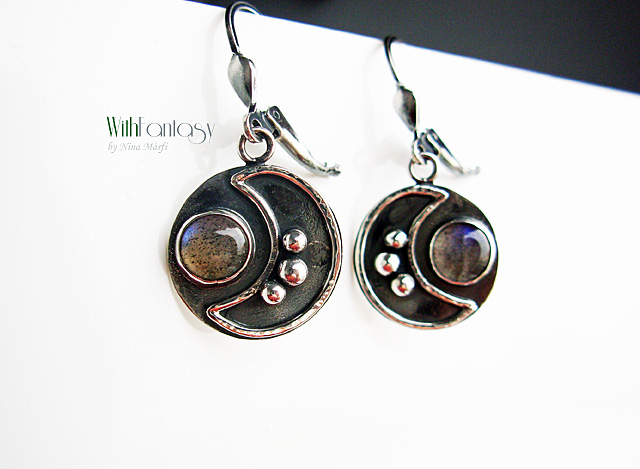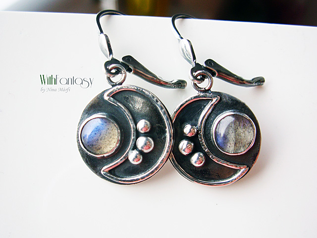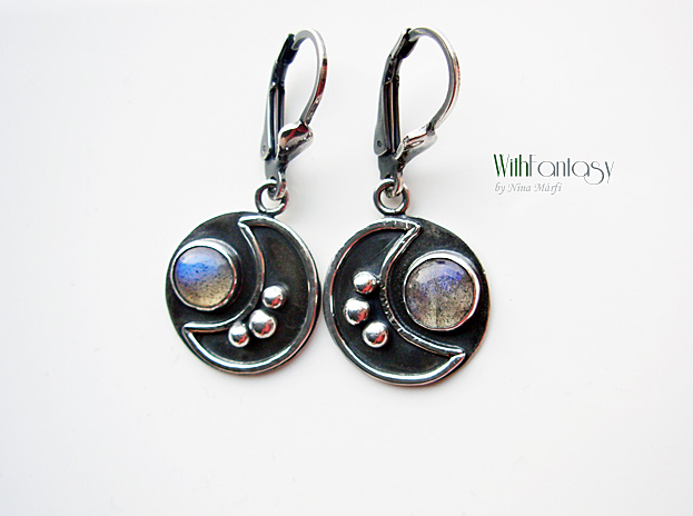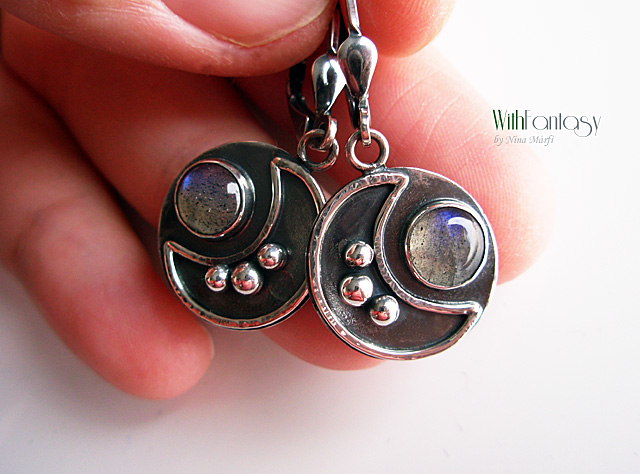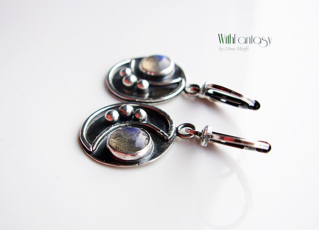 Egyedi, érdekes, ezüst fülbevaló kis, tiszta labradorit kabosonnal. A kövek erős kék fénnyel ragyognak.