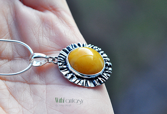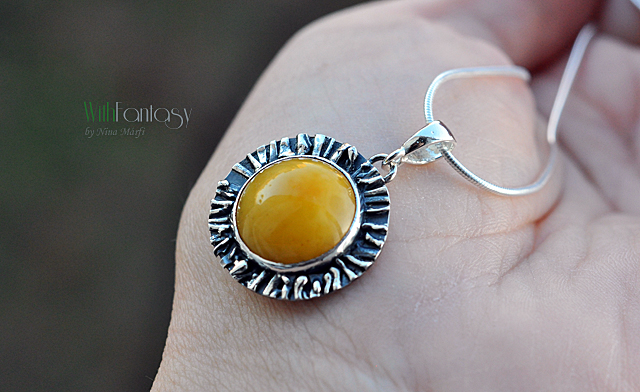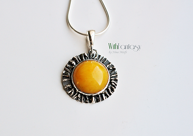 Egyedi, kézzel készült, ezüst medál mézes borostyánnal. Az ezüst oxidált és polírozott.