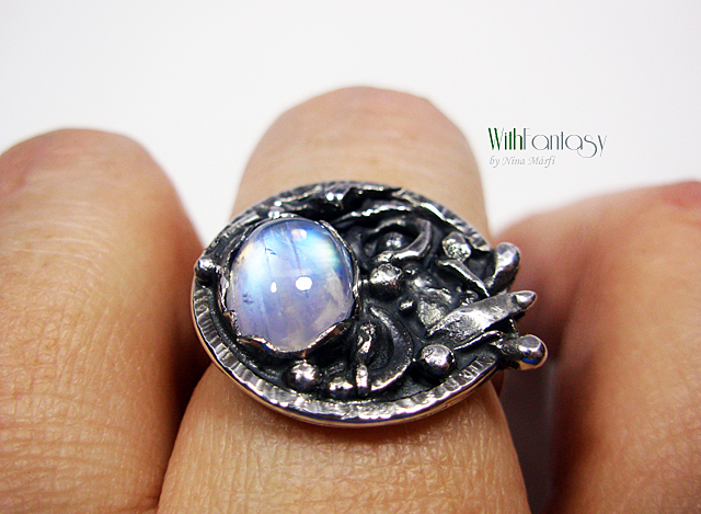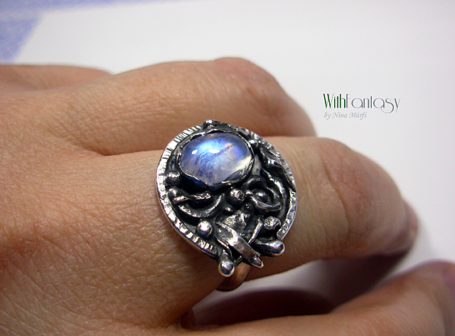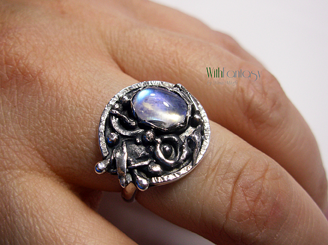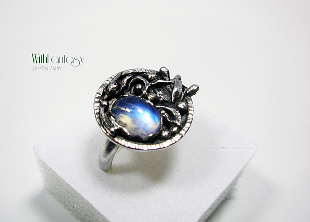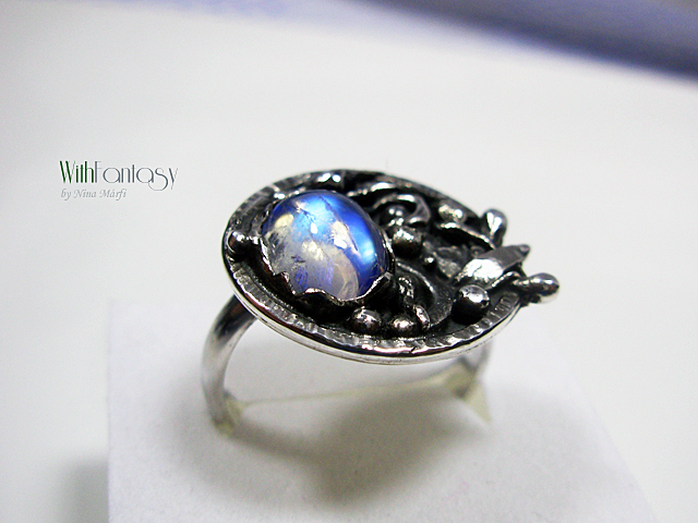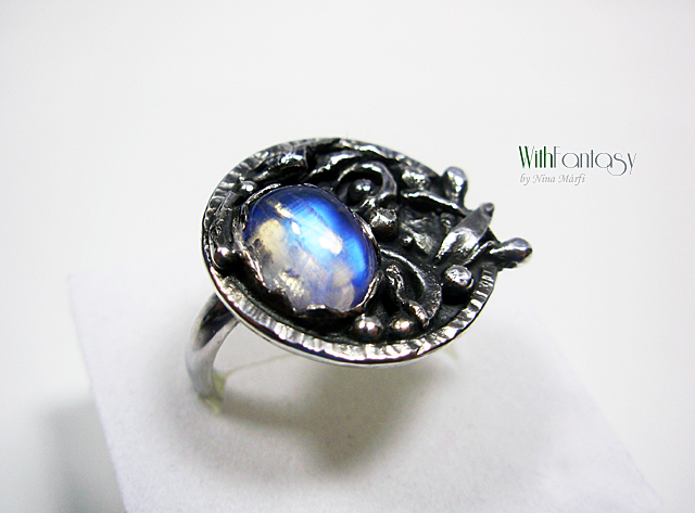 Egyedi, különleges, ezüst gyűrű gyönyörű, misztikus holdkővel. A gyűrű mesebeli formavilágú, nagyon különleges, biztoson felkelti az érdeklődést. A kő nagyon jó minőségű, erős kék fénnyel ragyog. Az ezüst oxidált és polírozott.