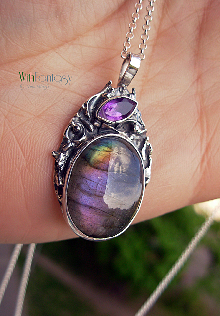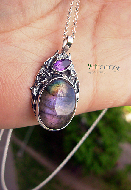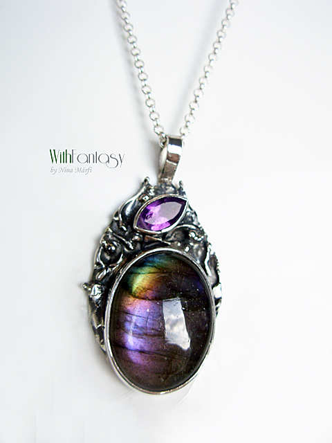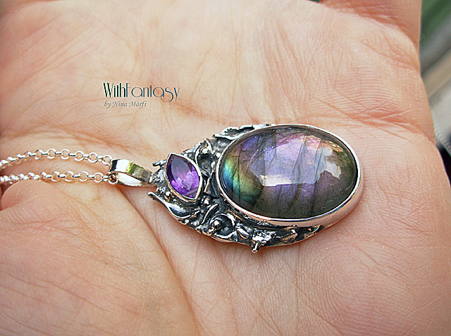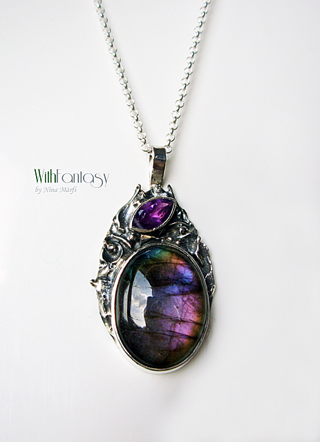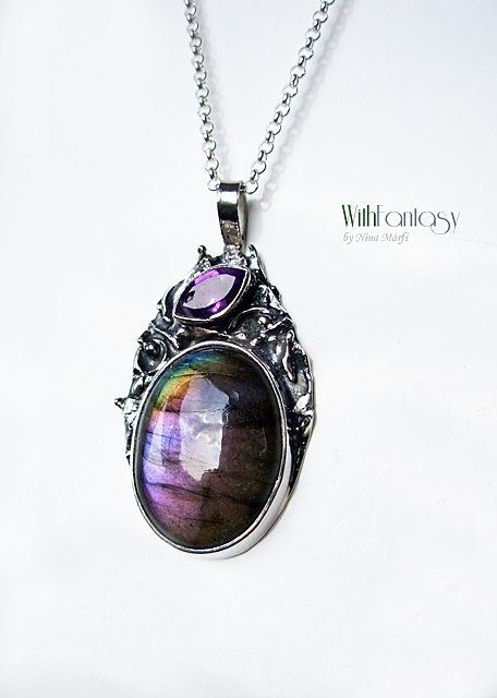 Egyedi, kicsit organikus medál gyönyörű, misztikus lila labradorittal és kis ametiszttal. A medál mesebeli formavilágú, nagyon különleges, biztoson felkelti az érdeklődést. A kő nagyon jó minőségű, erős lila és rózsaszín fénnyel ragyog. Az ezüst oxidált és polírozott.