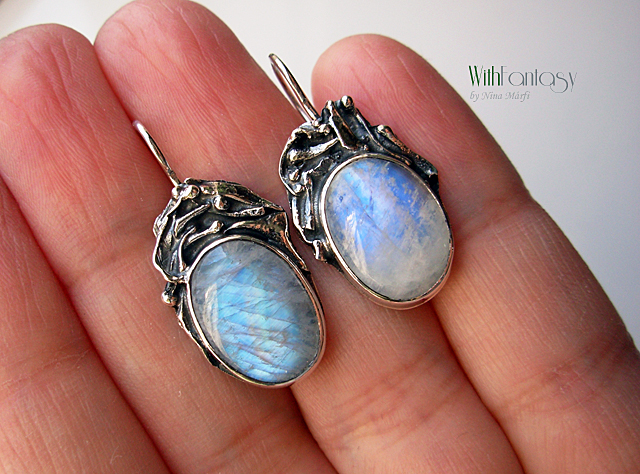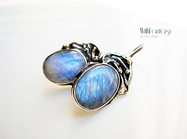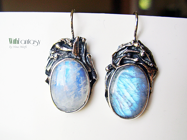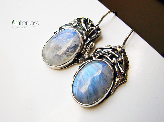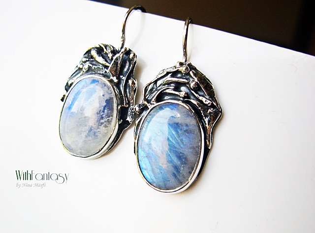 Egyedi, kicsit organikus fülbevaló tiszta, világos holdkövekkel és ezüst morzsák keretében. A fülbevaló mesebeli formavilágú, nagyon különleges, biztoson felkelti az érdeklődést. A kövek nagyon jó minőségűek, nagyon erős kék fénnyel ragyognak. Az ezüst oxidált és polírozott.