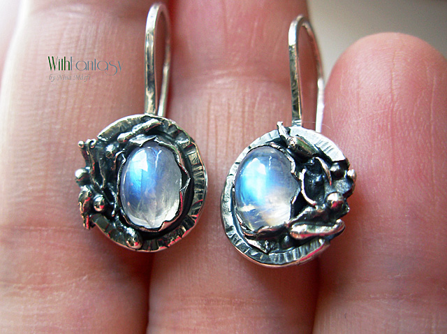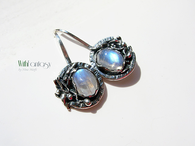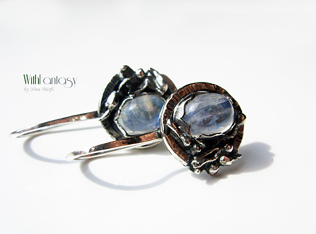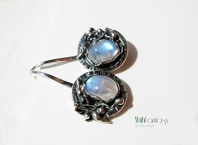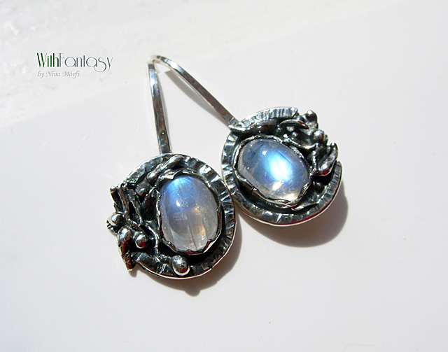 Egyedi, kicsit organikus fülbevaló tiszta, világos holdkövekkel és ezüst morzsák keretében. A fülbevaló mesebeli formavilágú, nagyon különleges, biztoson felkelti az érdeklődést. A kövek nagyon jó minőségűek, nagyon erős kék fénnyel ragyognak. Az ezüst oxidált és polírozott.