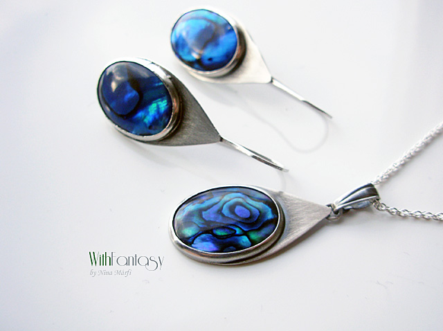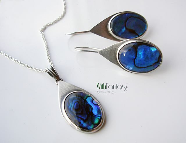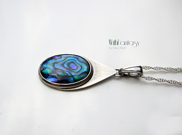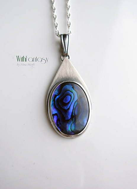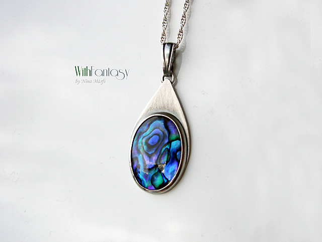 Egyedi, kézzel készült, ezüst medál gyönyörű, mélykék Paua kagylóval. Az ezüst oxidált és mattított.