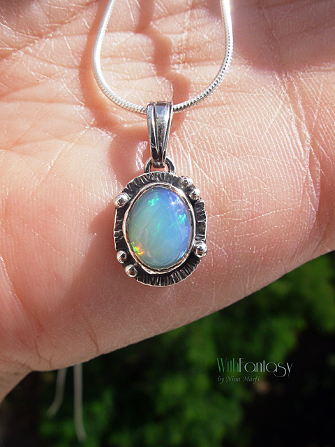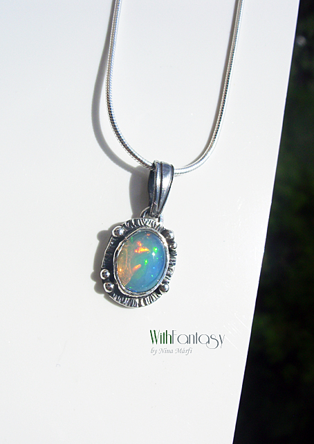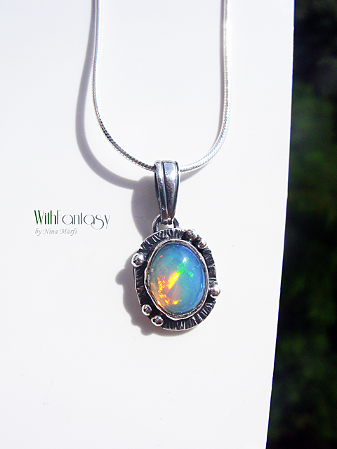 Kis, finom, ezüst medál gyönyörű, színes etiópiai opállal. Az ezüst oxidált és polírozott.