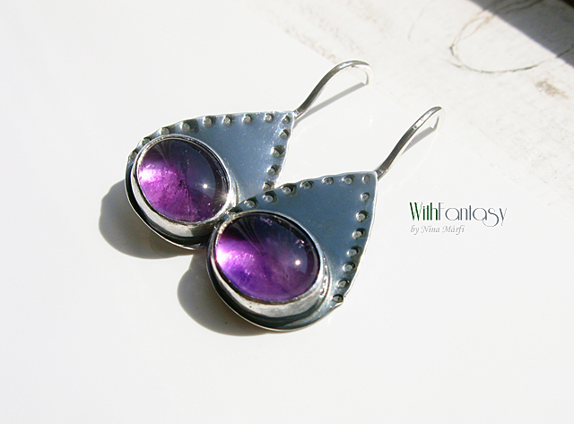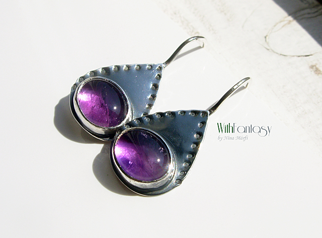 Kis, egyedi, teljesen kézzel készült fülbevaló gyönyörű ametiszt kabosonokkal. Az ezüst oxidált és polírozott.