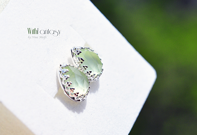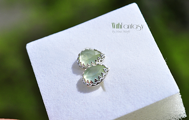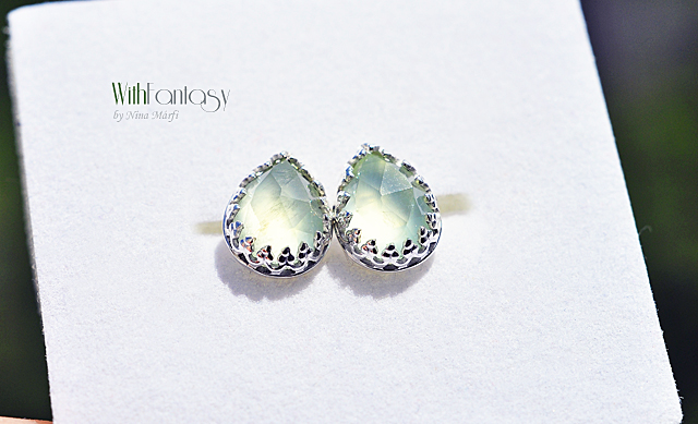 Romantikus, finom, ezüst nyári fülbevaló friss, világos zöld prehnittel. Az ezüst fehér és polírozott. A fülbevaló kézzel készült.