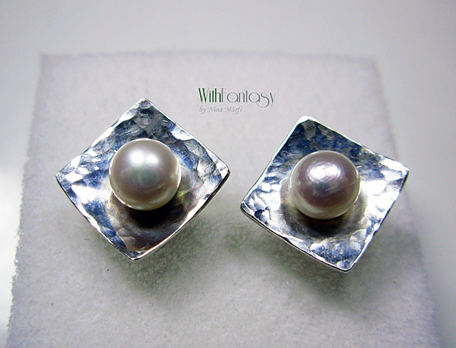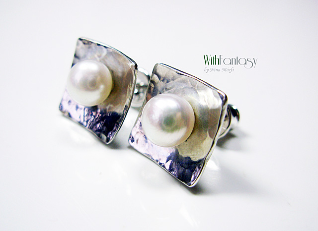 Egyszerű, bedugós, ezüst fülbevaló kis fehér gyöngyökkel. Az ezüst fehér, textutált.