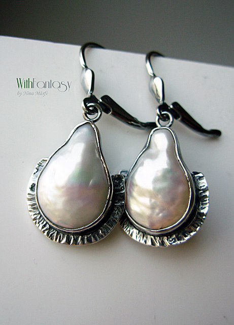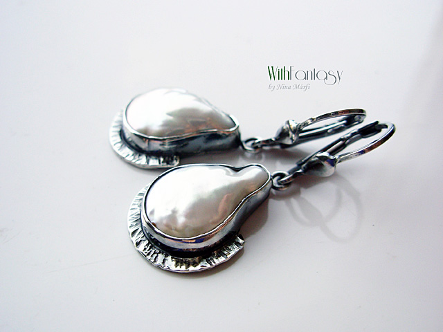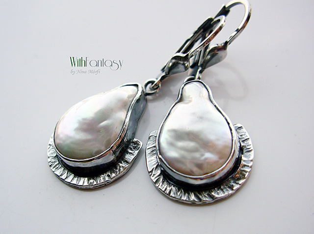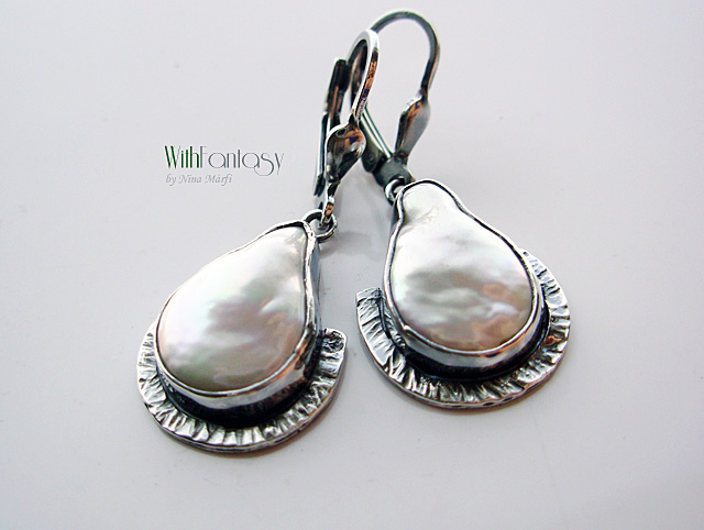 Egyedi, kézzel készült ezüst fülbevaló nagy, érdekes gyöngyökkel. Az ezüst oxidált és polírozott.