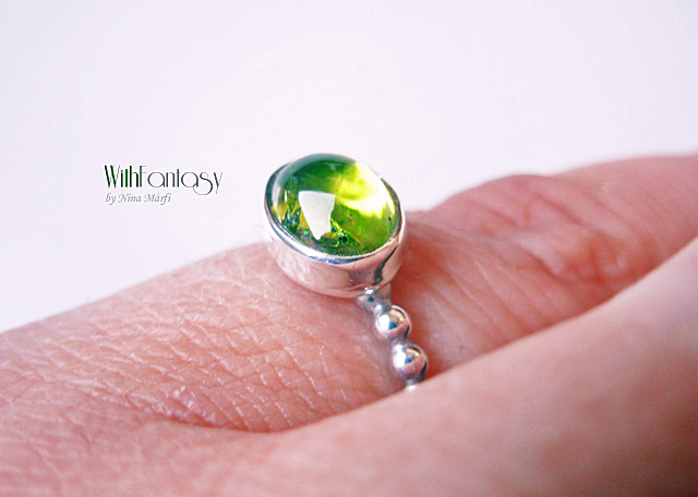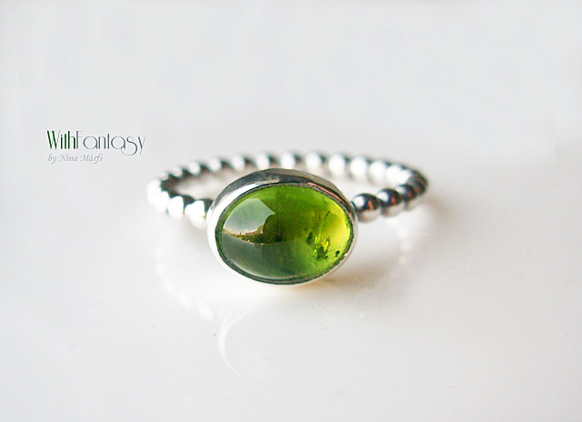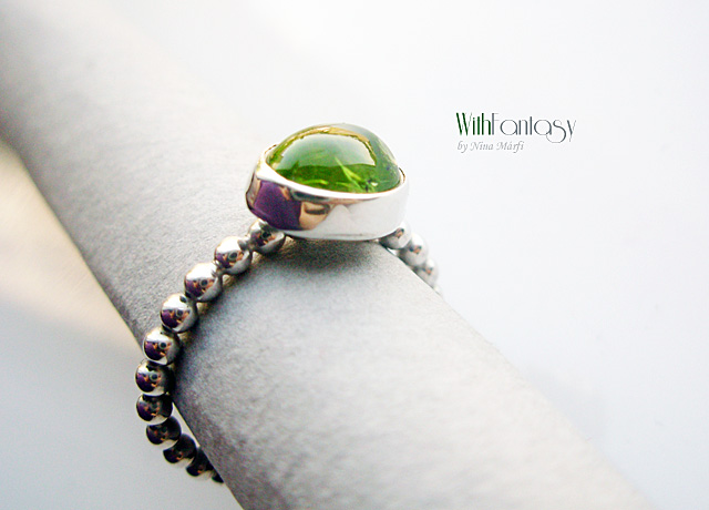 Egyszerű, ezüst gyűrű friss, intenzív zöld peridottal. A kő nagyon jó minőségű, tiszta, átlátszó. A színe tényleg gyönyörű.