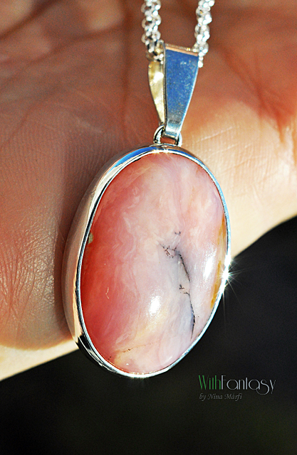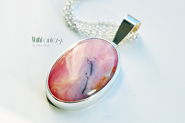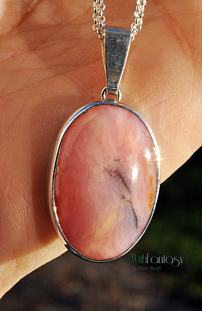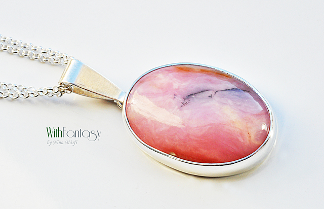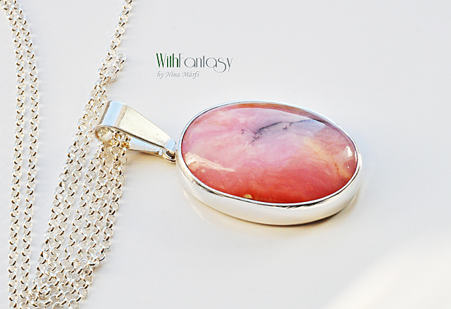 Egyszerű, ezüst medál győnyőrű, nagy, természetes pink perui opállal. A medál kézzel készült, az ezüst fehér és polírozott.