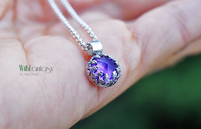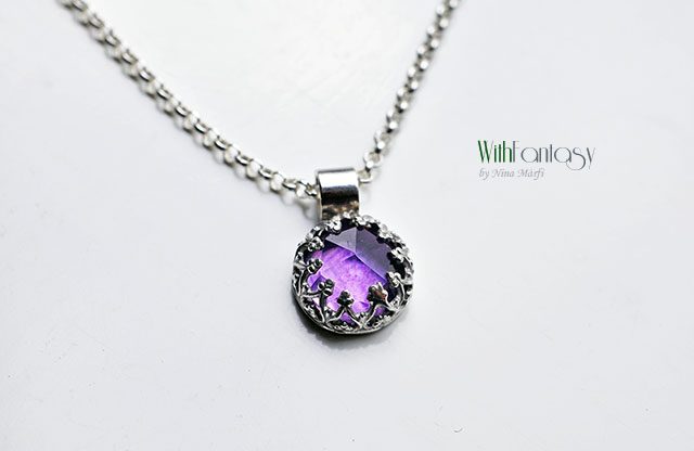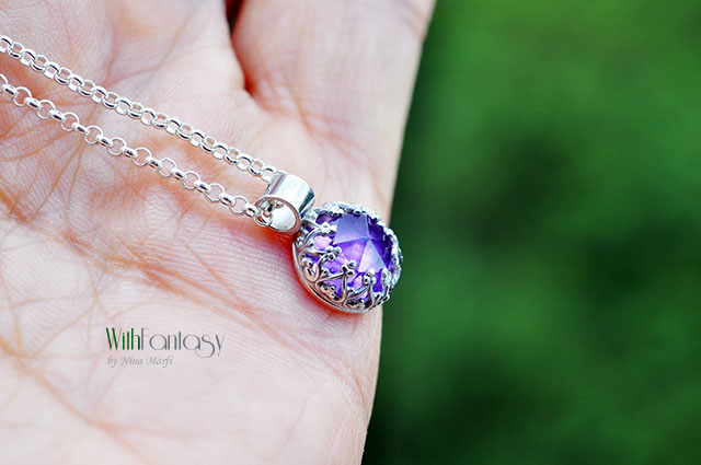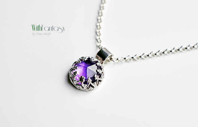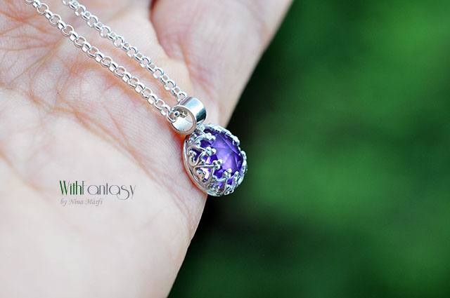 Romantikus, ezüst nyklánc gyönyörű kis ametiszttel. A kő nagyon szép, tiszta lila színű. Az ezüst fehér és polírozott