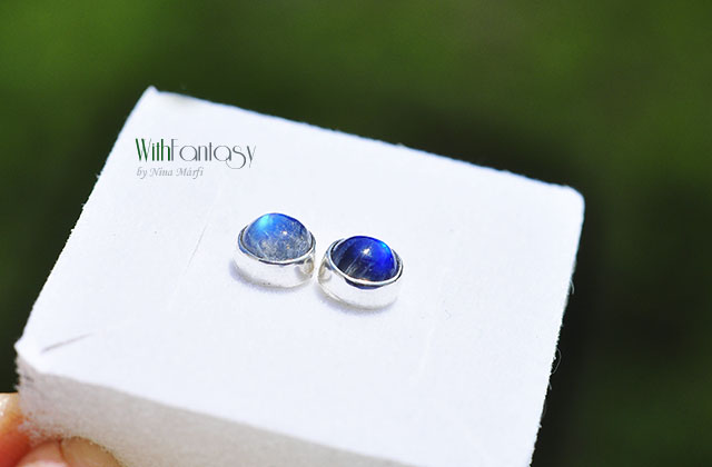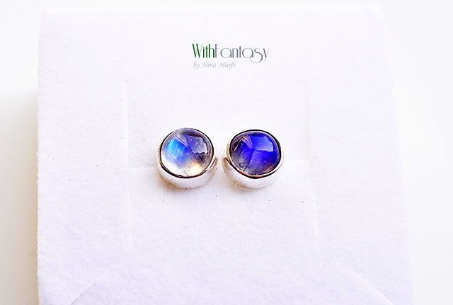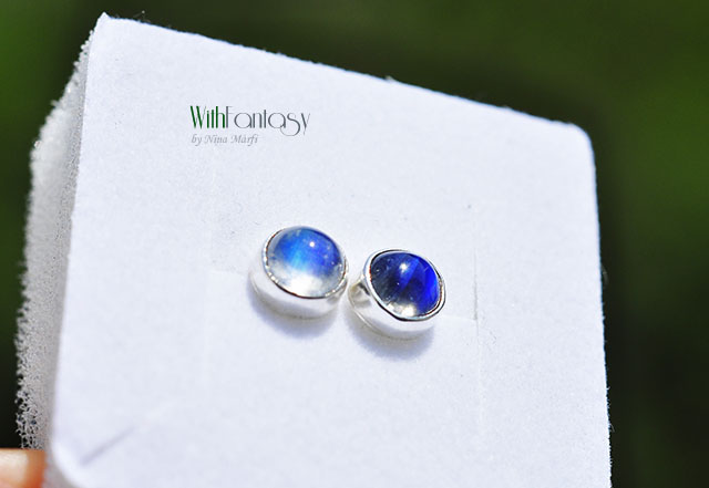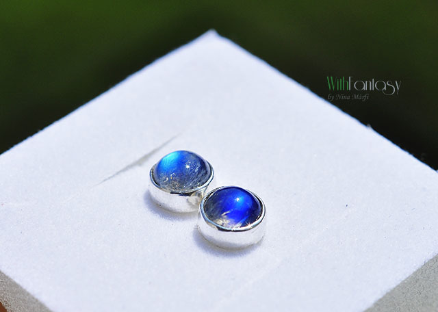 Apró, diszkrét, bedugós fülbevaló gyönyörű holdkövekkel, a kövek nagyon erős kék fénnyel ragyognak. Az ezüst fehér és polírozott.