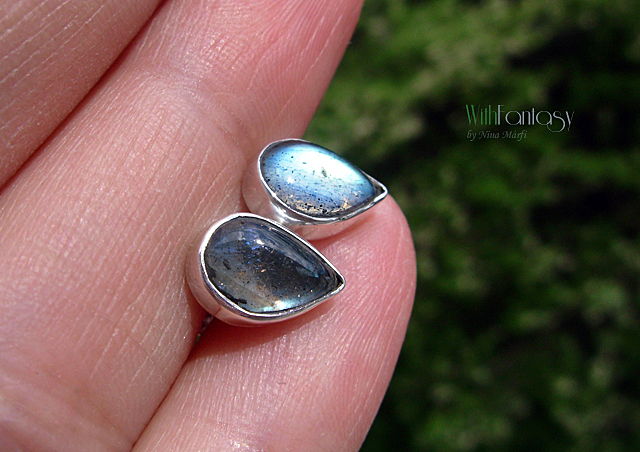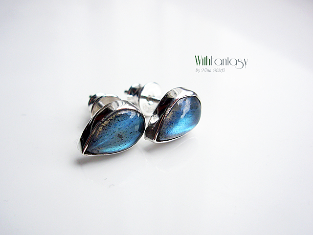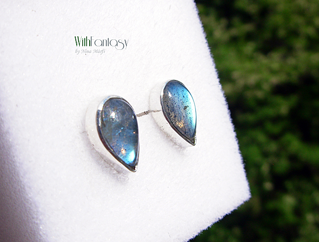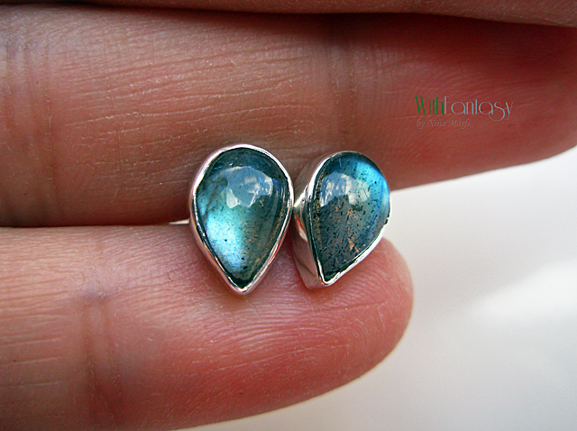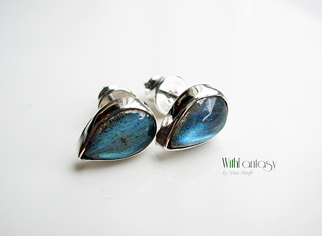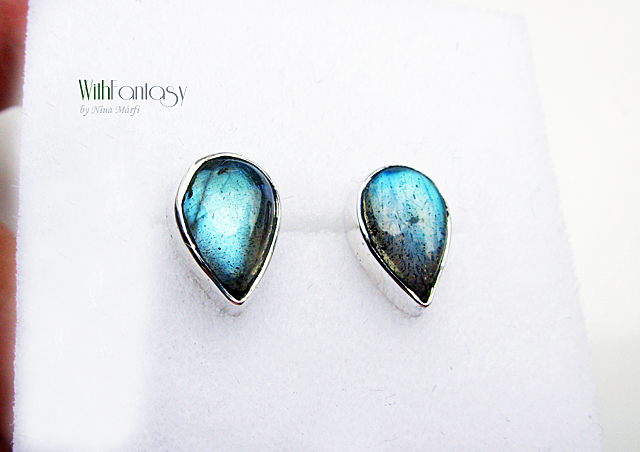 Klasszikus, univerzális, bedugós, ezüst fülbevaló tengeri kék labradorit cseppekkel. Az ezüst fehér és polírozott.