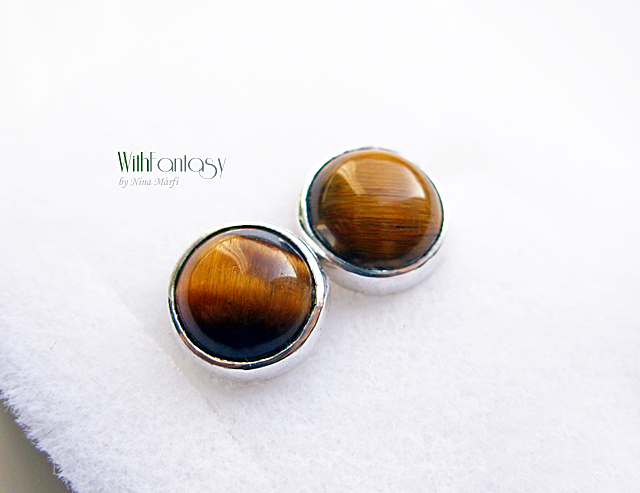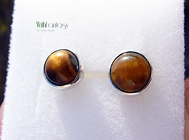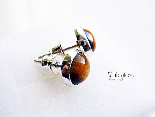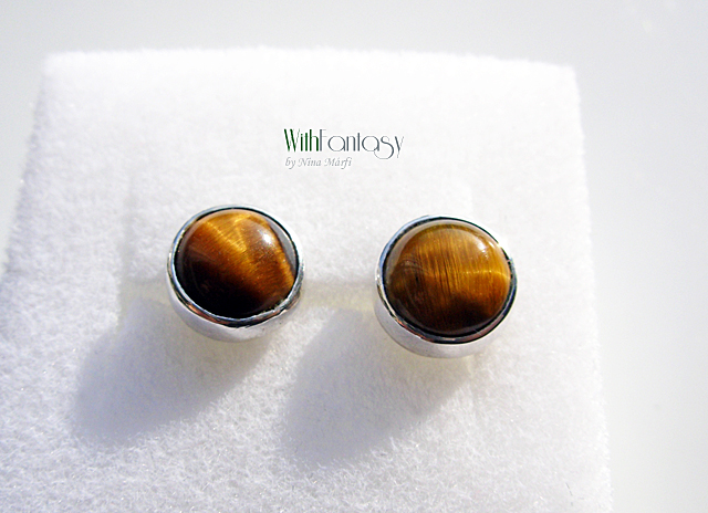 Klasszikus, univerzális, bedugós, ezüst fülbevaló gyönyörű arany tigrisszemmel. Az ezüst fehér és polírozott.