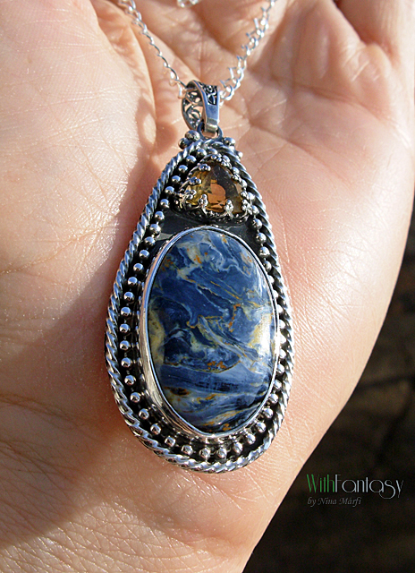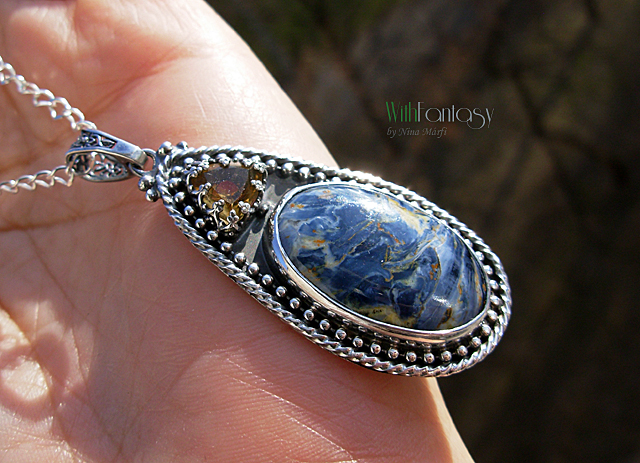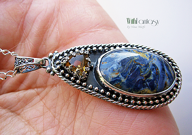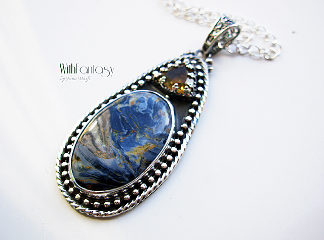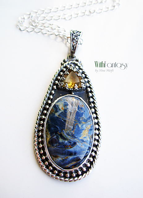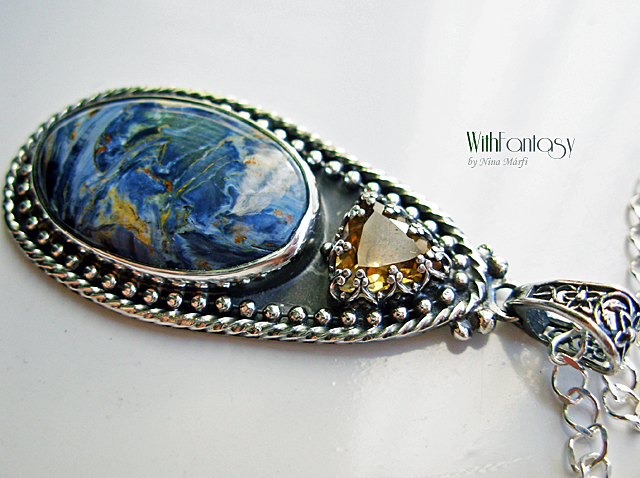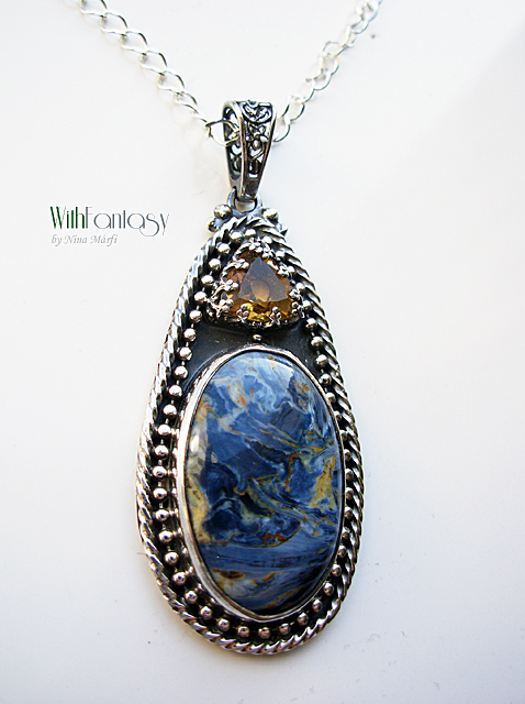 Elegáns, romantikus ezüst medál különleges pietersittel és kis fazettált citrinnel, az ezüsr erősen oxidált és polírozott. A medál rendélésre készült.