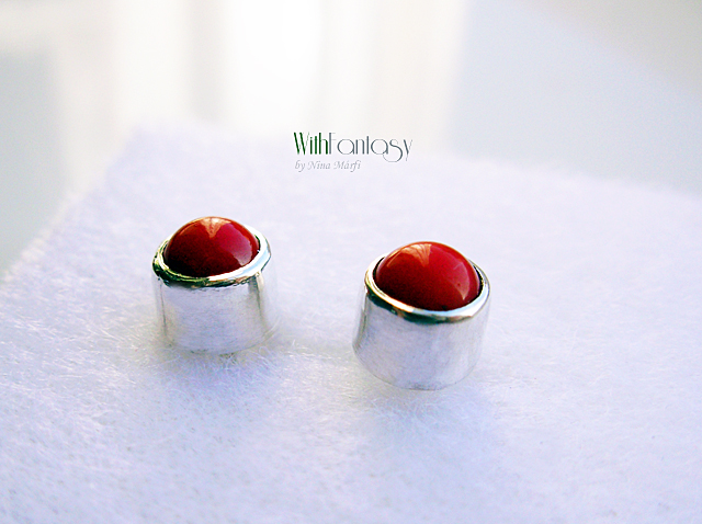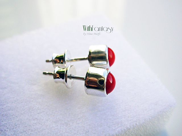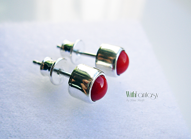 Kis, univerzális, bedugós, ezüst fülbevaló piros korallal. Az ezüst fehér és polírozott.