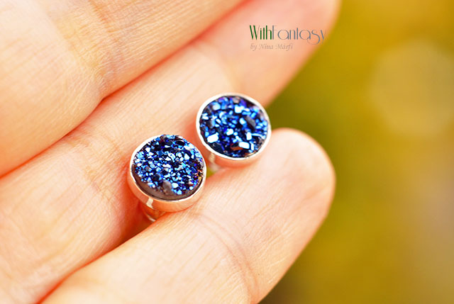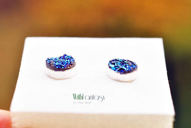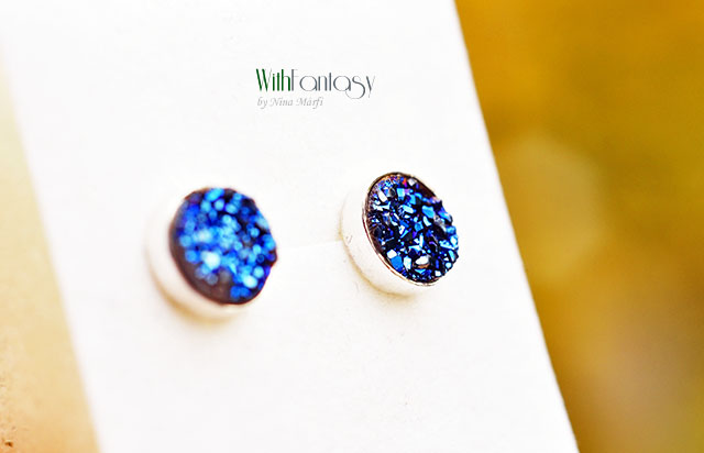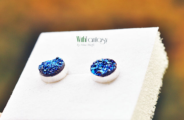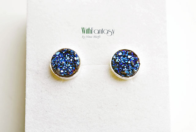 Egyedi, érdekes, ezüst, bedugós fülbevaló kék druzzy acháttal. A fülbevaló kézzel készült és polírozott. A kövek nagyon jó minőségűek, intenzív kék színűek.