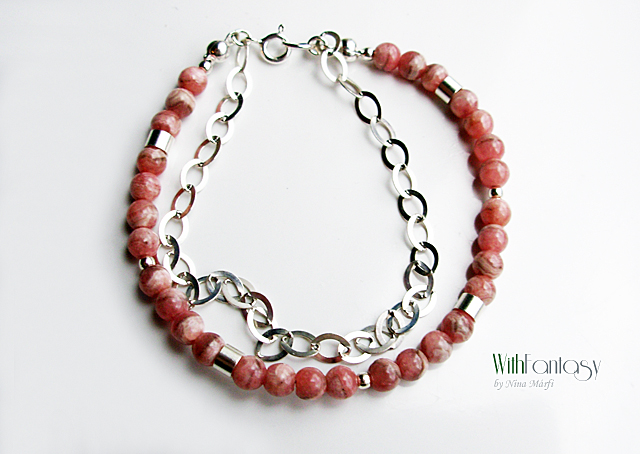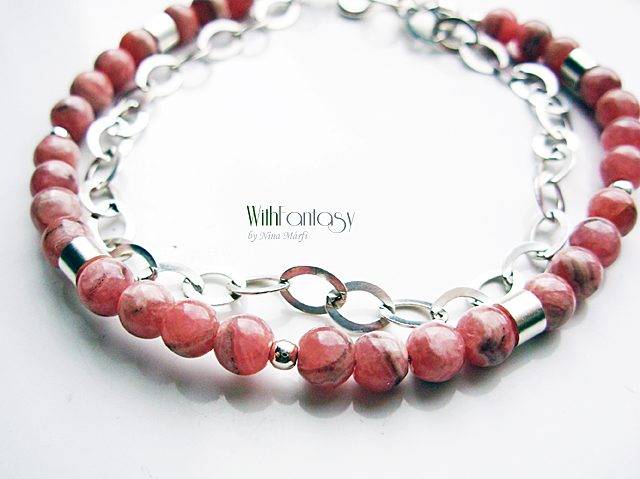 Finom, univerzális, ezüst kárkötő, kis rodokrozit gömbökkel (5mm).