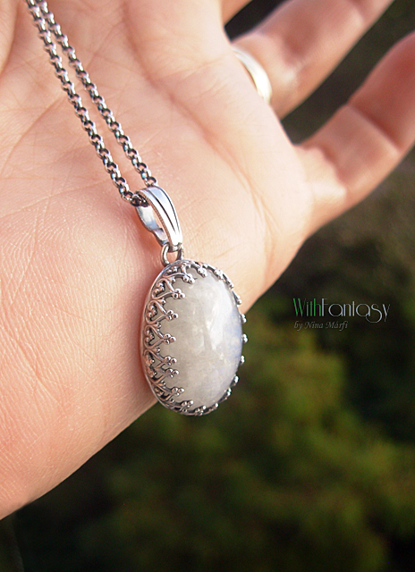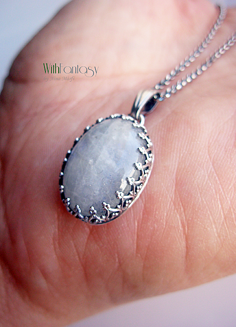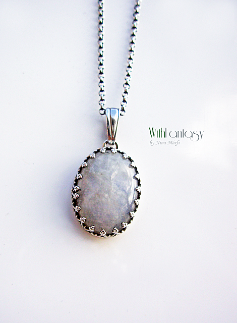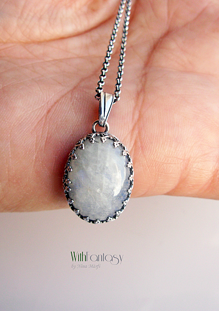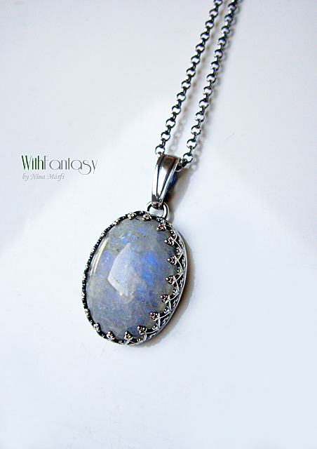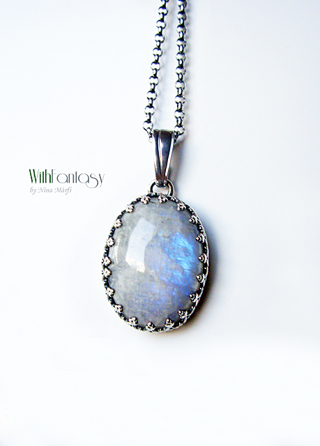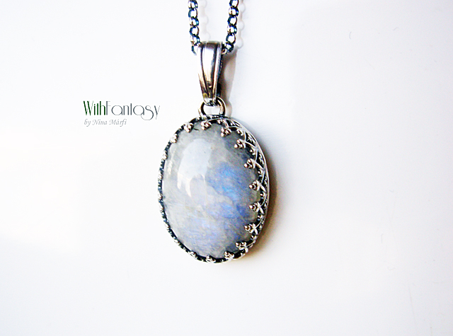 Igazan nőies, friss, világos és diszkrét medál gyönyörű holdkővel. A medál gyönyörűen fog kinézni a napbarnított bőrön. A kő világos, finom kék fénnyél ragyog.